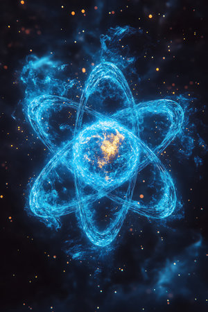 Glowing atomic structure illustration with bright blue energy, against a dark background