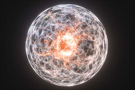 Orange energy sphere with glowing bright particles, atom with electrons and elektric magic field scientific futuristic hi-tech abstract background.
