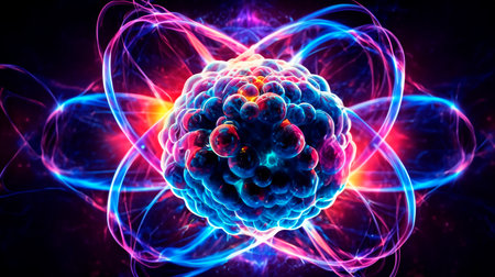 Colorful depiction of protons and neutrons orbiting a nucleus creating a tightly packed core