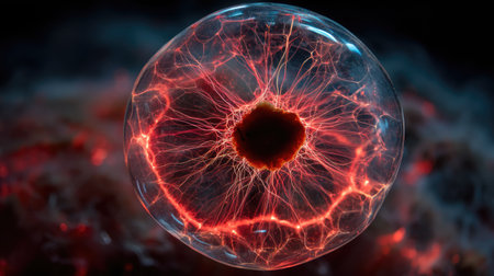Captivating image of a glowing cell showcasing intricate red patterns and vibrant electromagnetic effects. Perfect for science and technology themes.