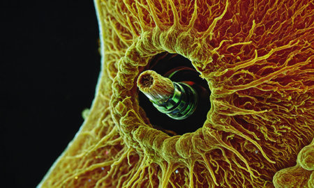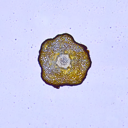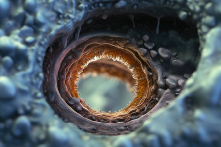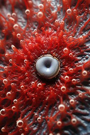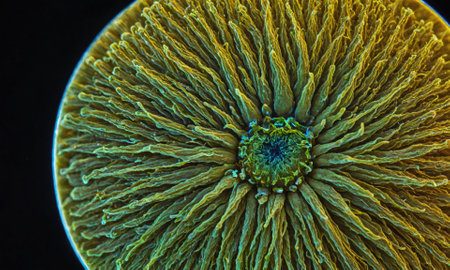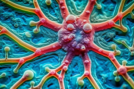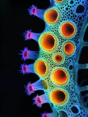 Intricate microscopic structure captivates with its vibrant colors and complex patterns, revealing details that highlight the beauty of biological formations often unseen.