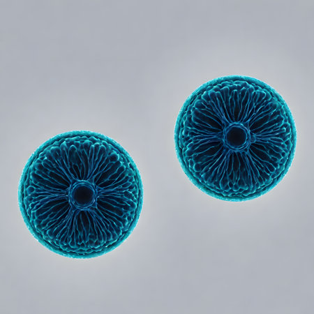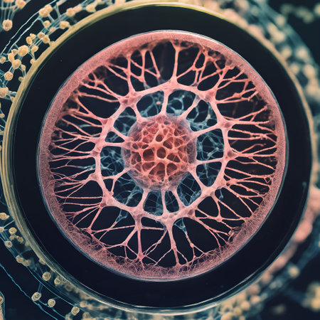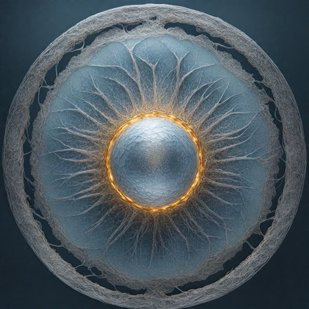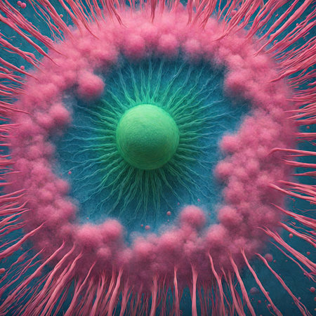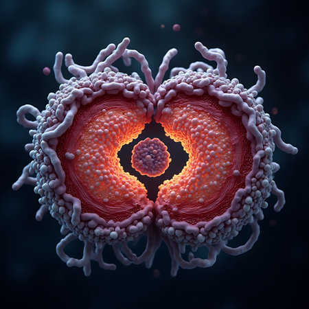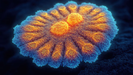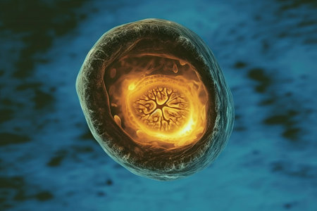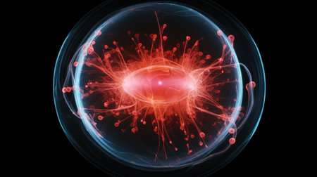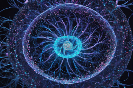 Detailed, digitally rendered cell-like structure with outer protrusions and an illuminated interior sphere against a dark background makes for striking abstract medical or scientific visualizations.