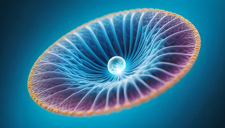 A highly detailed macro photograph or digital rendering of what appears to be a jellyfish or similar marine organism, captured in stunning detail against a deep turquoise background. The structure has a circular, dish-like shape with intricate radial patterns emanating from a central glowing orb. The edges are lined with a delicate orange-gold rim, while the main body transitions from electric blue to purple hues. The texture appears almost crystalline or bioluminescent, with detailed vein-like patterns throughout its translucent surface. The lighting and composition create a sense of ethereal beauty and natural geometry.