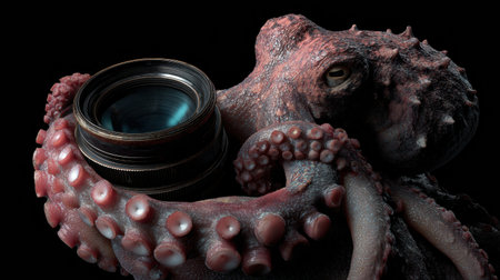 A realistic octopus grips a camera lens with its tentacles, showing artistic creativity in a dark and dramatic setting.