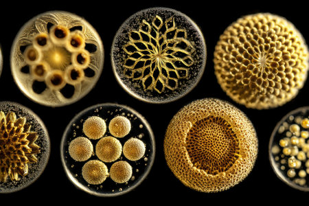 Intricate golden-hued circular patterns resembling microscopic organisms, each with unique designs, highlighted against a contrasting background, showing delicate textures and symmetry