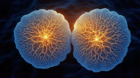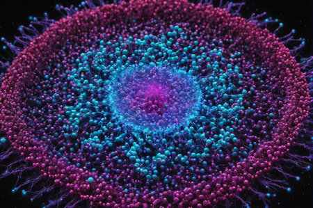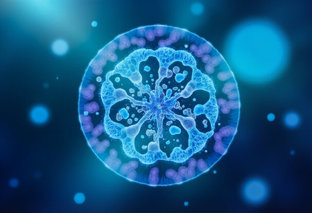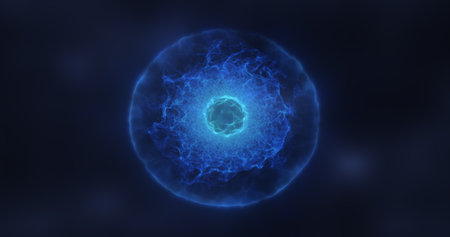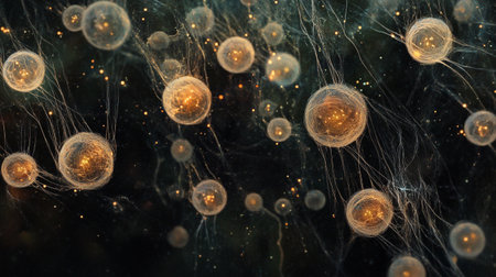 Intricate world of living cells in this closeup, showcasing glowing organic structures on a stunning blue background, revealing lives microscopic beauty