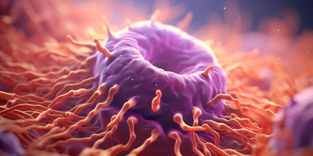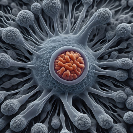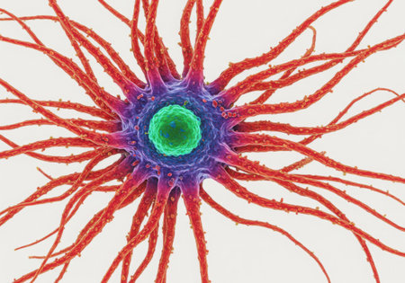 A detailed, colorful microscopic image of a single cancer cell with numerous tendrils extending outwards, isolated on a clean white background.