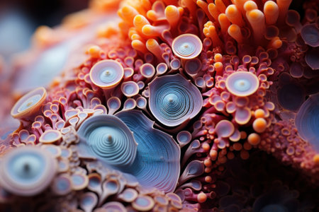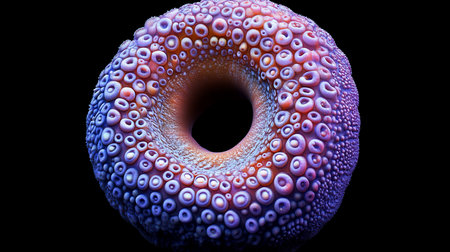 A detailed close-up of a toroidal object covered in a dense array of circular, sucker-like structures in varying sizes and shades of purple and orange.