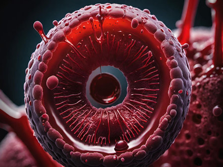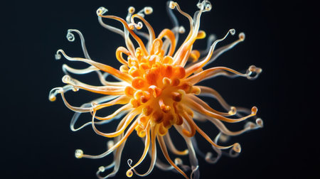 This image shows a close-up of an object that appears to be organic in nature, resembling a microscopic view of a cellular structure. The central focus is an orb-like formation with clusters of smaller, bead-like structures on its surface. Surrounding this are numerous filament-like protrusions, some with branching extensions, all against a dark background. The object and its protrusions are in various shades of pink and red, and theres a translucent quality to some of the extensions, giving a sense of depth and complexity. Water droplets are visible across the surfaces, suggesting a wet environment and adding a reflective quality to the image. The overall appearance is reminiscent of an image you might see in biology or microbiology related to cellular organisms, perhaps a virus, a sea anemone, or a stylized depiction of a cancer cell.
