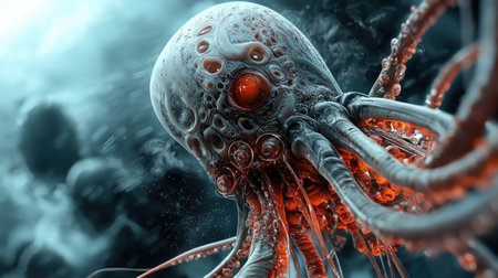 A detailed digital art piece showcasing a bizarre, alien-like octopus creature with glowing red eyes and long tentacles in a dark underwater environment.