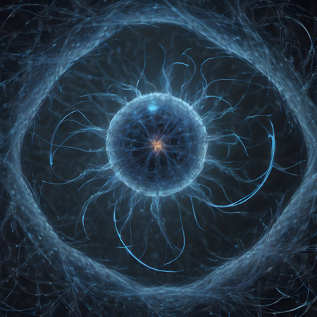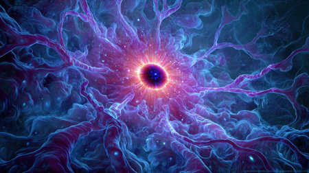 Experience a mesmerizing digital artwork depicting an abstract neural network, featuring a glowing core surrounded by vibrant energy waves in deep blue and purple hues.