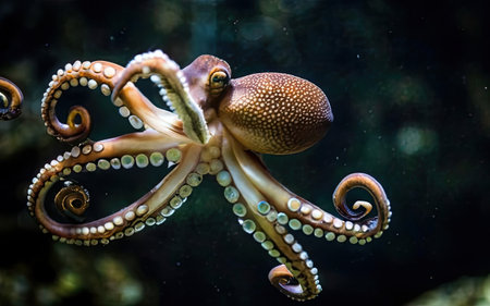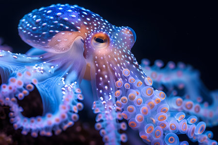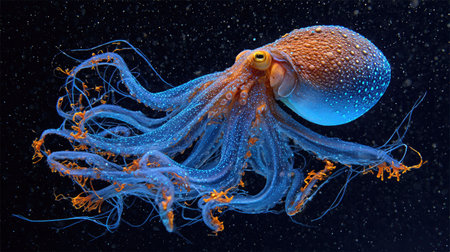 An octopus, with blue and orange hues, is captured against a dark background. Its tentacles extend gracefully, showcasing intricate details and textures. The image uses dramatic lighting, emphasizing the creature's form and color. Suitable for various editorial and commercial applications, it highlights the beauty of marine life.