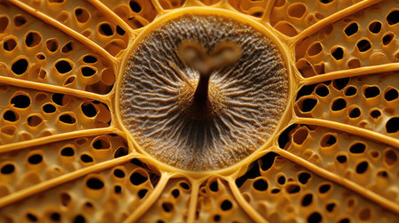 Abstract image featuring a circular pattern of concentric layers with golden and dark hues, resembling a mandala or organic structure. Detailed, intricate design with a rich texture