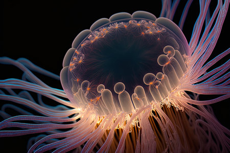 A closeup of the transparent jellyfish tentacles, each petal with tiny beads that glow in shades of orange and blue against an isolated black background.