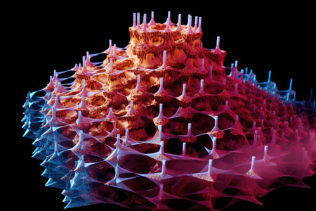 Detailed view of a vibrant cellular formation featuring intricate designs and textures, creating a mesmerizing visual effect.