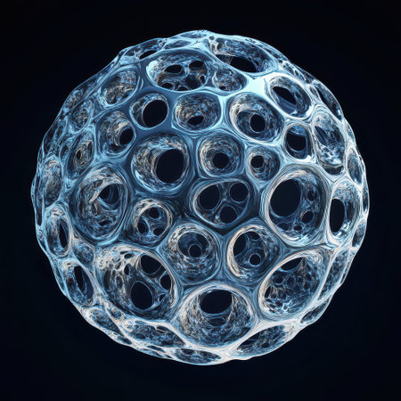 A spherical form composed of interconnected circular openings creating a transparent appearance that suggests complexity and depth.