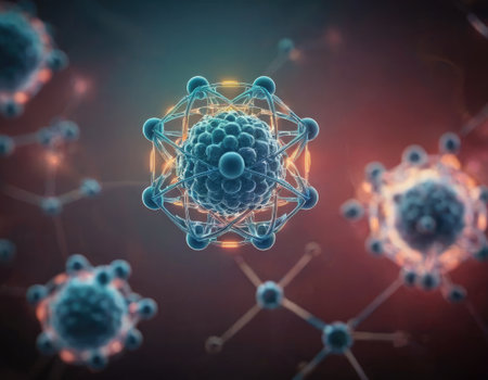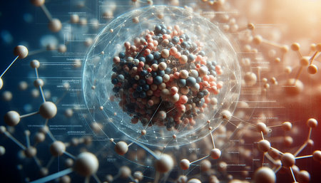 An abstract illustration presents a molecular structure with a central glowing core. The image features a network of spheres connected by lines, set against a dark blue background. The composition uses depth of field with bokeh effects, possibly for scientific or technological contexts. Suitable for various commercial and editorial applications.