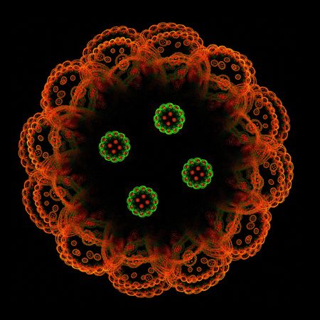 Colorful depiction of protons and neutrons orbiting a nucleus creating a tightly packed core