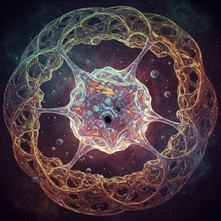 Complex visual of atomic structures intertwined with cosmic elements in vibrant colors and patterns.