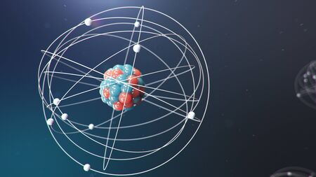 Atomic model structure depicting atoms and their electrons orbiting around nucleus, conceptual 3d rendering