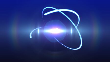An artistic depiction of an atom featuring glowing particles surrounded by a dynamic swirl of light.