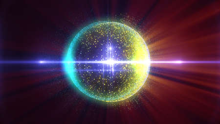 quantum futuristic computer animation abstract pastel tone light sphere ball and light blue core with atom moving by infinity of orange fire green nature and blue thunder energy
