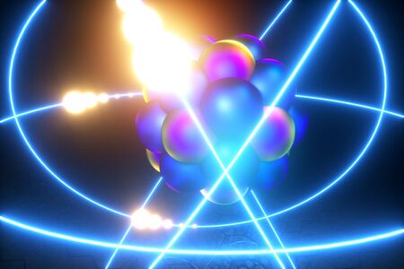 3D Illustration Atomic structure. Atom is the smallest level of matter that forms chemical elements. Glowing energy balls. Nuclear reaction. Concept nanotechnology. Neutrons and protons - nucleus.