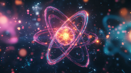 Colorful atomic models with glowing particles floating in a dark background, illustrating atomic structure and energy.