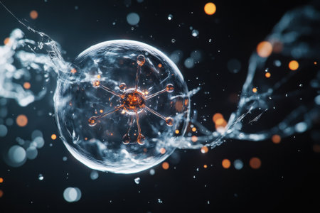 Close-up view of a water droplet colliding with a molecular structure, creating ripples and sparkling effects.