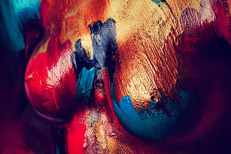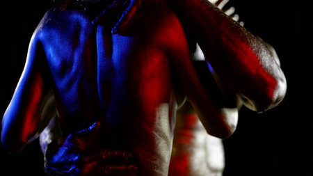 Multicolor body. One graceful attractive man, model, dancer posing with hands over dark studio background with neon light. Back view. Contemporary ballet. Grace, art, professional sport concept