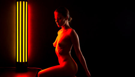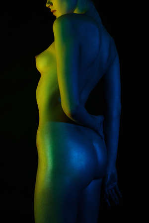 Shining skin Nude Woman, Colorful bright lights posing in studio. Beautiful Naked body of Girl