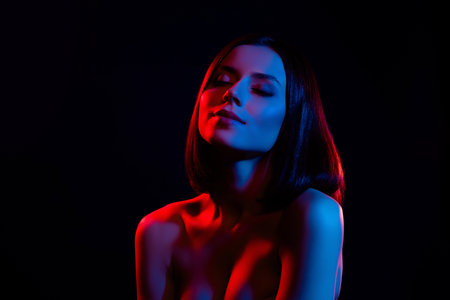 Photo of pretty girl feel tenderness close eyes under neon light isolated over dark background