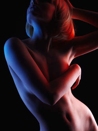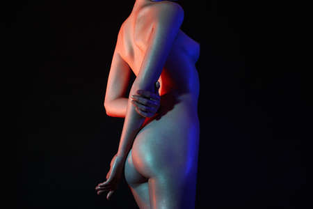 Tender femininity. Cropped image of naked female body, woman sitting and covering breast with hand against blue background in neon light. Concept of body aesthetics, art, beauty, sensuality