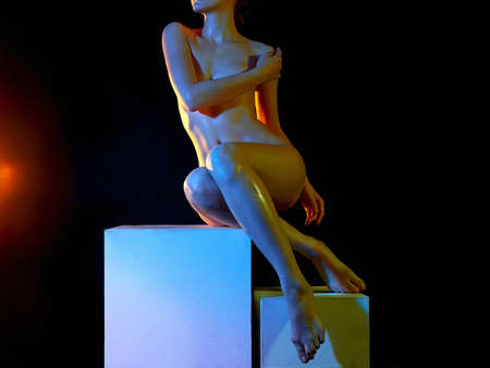 Nude Woman, Colorful bright lights posing in studio. sparkling shiny Naked body of Girl on cube