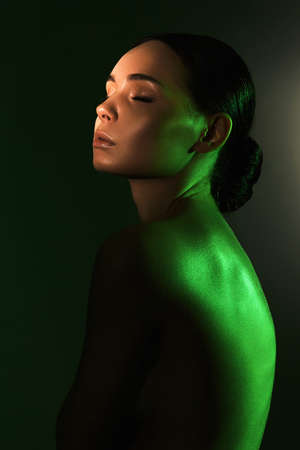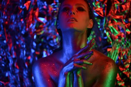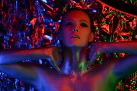 beauty young woman in colorful lights. beautiful girl with make-up and shining Body