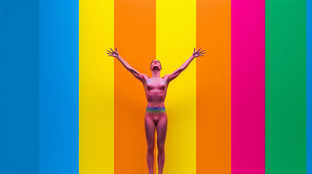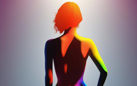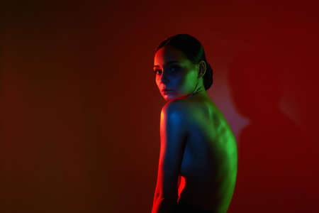 Back of Nude Woman, Colorful bright lights posing in studio. sparkling shiny Rainbow Naked body of Girl