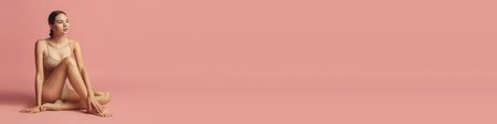 One young beautiful tanned girl with perfect figure in underwear lying on floor over pink studio background. Concept of female beauty, tenderness, body and skin care. Banner, flyer