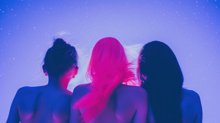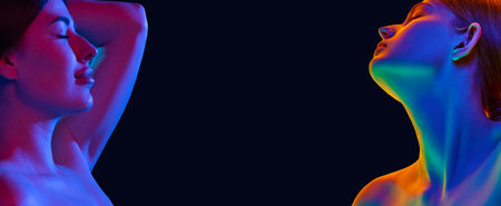 Collage. Vibrant neon-lit profiles of women, exploring futuristic beauty against black studio background in colorful neon lights. Concept of beauty, self care, dermatology, spa procedures. Copy space.