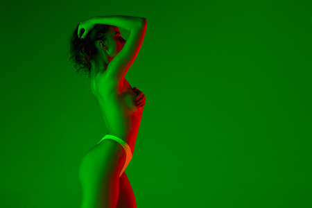 Stylish. Beautiful female body on green background in neon light. Beauty, cosmetics, spa, depilation, diet and treatment, fitness concept. Fit and sportive, sensual body with well-kept skin.