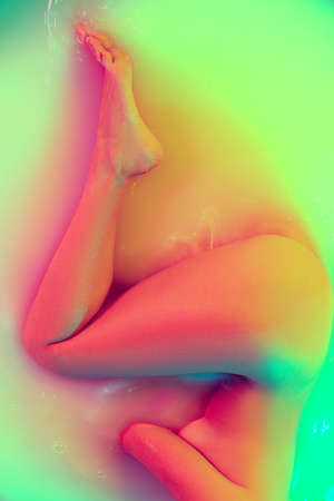 Legs and belly. Close up female body in the milk bath with soft white glowing in neon light. Beauty, fashion, style, bodycare concept. Attractive