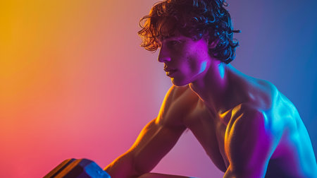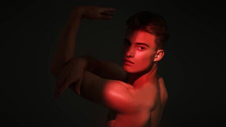 sexy not guy athlete touches face with hand on neon background and isolated black color