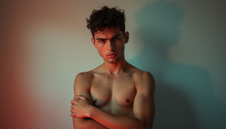 sexy guy with athletic physique posing on a black background and holds his hand near his face