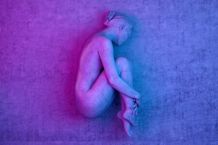 Young and beautiful naked woman sitting on floor and posing dressed in lingerie and looking away against gradient background in neon. Concept of art, female health, wellness, self-expression.