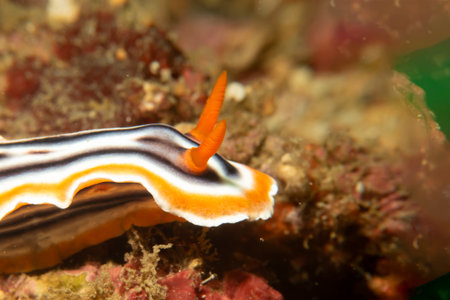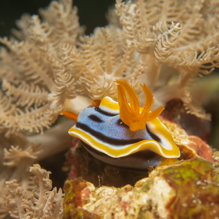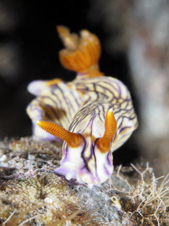 A supermacro photo of Annas Chromodoris, or Chromodoris annae at a tropical coral reef in the Philippines.