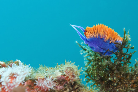 A beautiful sea slug in purple and white color. Nudibranch Flabellina in a tropical coral reef