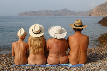 Homosexual couple on pebble beach. Two women 30 and 40 years sunbathing naked sitting on pool raft leaning back their hands