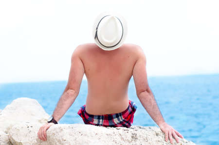 Man on beach lying on beach rocks wearing hipster summer hat. Young male model enjoying summer travel holiday by looking at the ocean