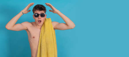 young teenager or student isolated with sunglasses and beach or pool towel surprised