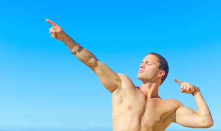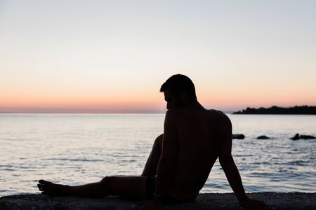 Attractive young shirtless athletic man leaning on big rock on ocean or sea shore, looking at camera