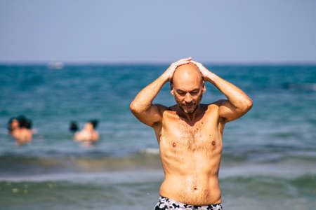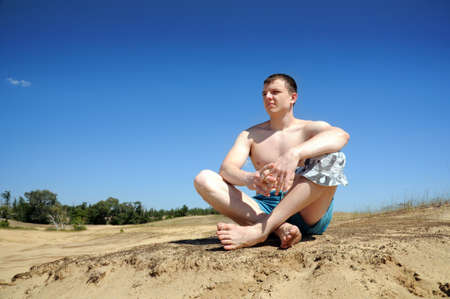 Guy sitting on the sand in the lotus position. Summer hot sun